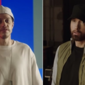 Just as Davidson gets comfortable with his Eminem imitation, the illustrious rapper himself appears and shouts at the “King of Staten Island” star from off-camera. In his classic poker face, Eminem looks at Davidson in question.