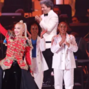 As her (or No Doubt’s) foremost ballad, “Don’t Speak” was the most obvious choice for an “evening at the pops” symphonic treatment, so there was little surprise in hearing that come up as the opening number. “The Sweet Escape” wasn’t such an obvious candidate for Dudamel-ization, and it didn’t end up being something you’d say gains something from replacing bass and drums with oboes. With “Spiderwebs,” the adaptation made some sense: it’s not such a complete leap, after all, from the horns on a record produced when No Doubt was easing out of its ska phase to the 76 (or so) trombones the LA Phil has to offer. Two more string-sweetened ballads followed — “Used to Love You,” followed by newish husband Blake Shelton coming out to reenact his duet part on “Nobody But You,” offering the evening its schmaltz quotient.
