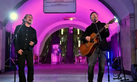 Following a personal invitation from Ukraine president Volodymyr Zelensky, U2’s Bono and the Edge visited Kyiv Sunday to perform an acoustic concert in one of the city’s subway stations-turned-bomb shelters.