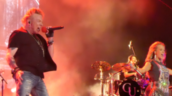 When Carrie Underwood’s band broke into the opening strains of “Sweet Child o’ Mine” at the Stagecoach Festival Saturday, it seemed like business as usual. The country superstar’s Guns N’ Roses fangirl-ism is well known, and she’s incorporated GNR numbers into her set on a regular basis before, even showing an aptitude for appropriating Axl Rose’s snaky frontman moves as her own. But within a few bars, she let loose the closely held secret that, tonight, paradise would be a shared experience. “Welcome to the greatest night of my life,” Underwood shouted. “Give it up for Axl Rose!”